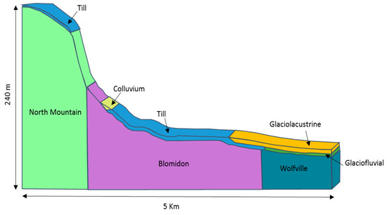Figure 3 depicts five geological formations representing the surficial geology of the watershed which is composed mostly of tills (covering near 70% of surface), glaciolacustrine formation (in the lower part of the catchment), colluvial deposits at the foot of the North Mountain formation, modern alluvium deposits, and glaciofluvial sands (underneath the glaciolacustrine formation) in the lower part of the catchment (Figure 3) [19]. The dominant surficial deposits (till and glaciolacustrine layers) have very low hydraulic conductivity (from 10−5 to 10−7 m/s) [21] which greatly reduces the magnitude of the groundwater recharge and also protects the underlying aquifer against contamination resulting from agricultural activities [19].