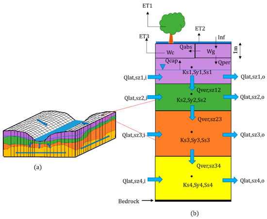 (a) Domain discretization in MOBIDIC-MODFLOW and in MIKE SHE; (b) schematic diagram of the hydrological fluxes in MOBIDIC-MODFLOW. Inf: Infiltration, ET1: Canopy transpiration, ET2: Surface water evaporation, ET3: Root transpiration, Wg: Gravity reservoir, Wc: Capillary reservoir, Qabs: Absoption flux, Qper: Percolation to groundwater, Qcap: Capillary rise, Ksi, Syi, Ssi: Saturated conductivity, specific yield, and specific storage of layer i, Qlat,szi,i: Lateral inflow to the layer i, Qlat,szi,o: Lateral outflow from layer i, Qver,szij: Vertical flow from layer i to j. Note that the top 1 m of the soil profile is represented by MOBIDIC, while the underlying layers are modeled by MODFLOW.