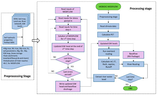 Flowchart showing integration procedure of MOBIDIC and MODFLOW. The blue and purple colors represent the process conducted in MOBIDIC and in MODFLOW, respectively.