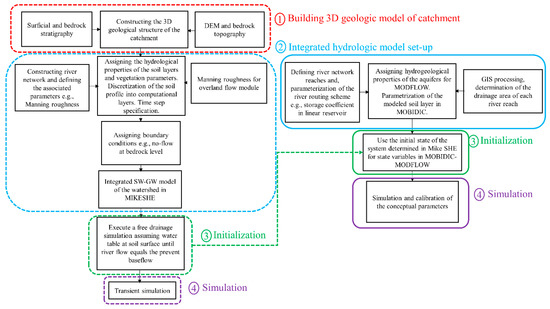 The step-by-step procedure of integrated surface water-groundwater modelling of the Thomas Brook catchment with MIKE SHE and MOBIDIC-MODFLOW. The left side (boxes in dash) represents the process followed in MIKE SHE and the right side (solid box) shows the corresponding steps in MOBIDIC-MODFLOW. Note that step 1 is similar in both models.