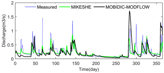 The simulated streamflow of the two models compared to flows measurements at the catchment’s outlet are shown in Figure 8. It can be seen that both models can adequately capture the general trend of observations except for peaks that are not precisely captured by neither of the models. The Nash–Sutcliffe efficiency and percent-bias measures were 0.32 and −0.09 for MIKE SHE and 0.12 and −0.3 for MOBIDIC-MODFLOW. This could be improved with more data on the surface roughness and cross sections of the river networks and by adjusting hydraulic conductivities through model calibration.