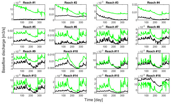 Simulated aquifer-river flow exchange of the river reaches using MIKE SHE (green) and MOBIDIC-MODFLOW (black). Note that positive values represent flow from aquifer to river and negative value represents flow from river to aquifer.
