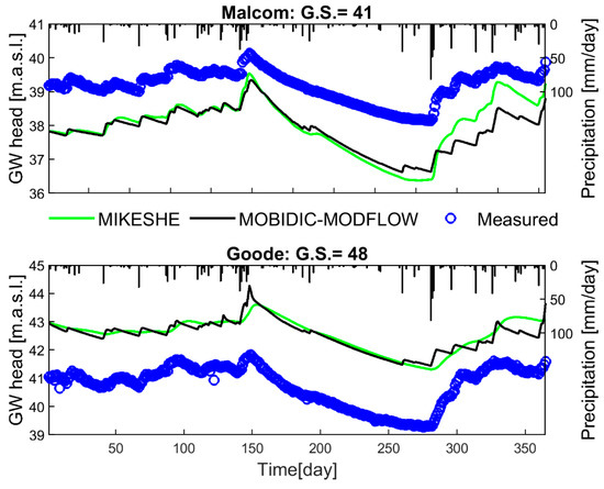Total infiltration between days 100 and 150 at Malcom for MOBIDIC-MODFLOW and MIKE SHE was 205 and 256 mm, respectively. Since both models show no snowpack during this period, the difference in infiltration is related to the way the evaporation is calculated from the available surface water. In MOBIDIC-MODFLOW, available water evaporates prior to the infiltration to satisfy the unfulfilled evapotranspiration. In MIKE SHE, however, infiltration happens first and evapotranspiration is fulfilled by the soil moisture extracted from the unsaturated zone, unless the water table is at soil surface which results in evaporation of the entire ponded water at the soil surface. Infiltrated water is considered as the upper boundary condition of the solution of the Richards equation in MIKE SHE. The evapotranspiration and groundwater recharge are calculated following the solution of the unsaturated flow module. The calculated groundwater recharge in this period is 128 and 84 mm for MOBIDIC-MODFLOW and MIKE SHE, respectively. The larger value of groundwater recharge in MOBIDIC-MODFLOW, however, did not lead to significant difference between the water tables of the two models since the specific yield in MOBIDIC-MODFLOW was larger than MIKE SHE, 0.07 versus 0.02. As discussed in Section 3.1., specific yield in MIKE SHE is defined as the difference between the water content at saturation and field capacity of the geological unit (see Table 1), and its variations in shallow water tables are handled using the water table correction procedure in the unsaturated flow module [3]. In MOBIDIC-MODFLOW, however, a constant value for specific yield (determined through the calibration of simulated groundwater heads of MOBIDIC-MODFLOW in comparison to MIKE SHE at Malcom and Goode grids shown in Figure 10) is assumed for the entire catchment.