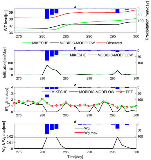 Figure 11 compares the simulated results of groundwater head, infiltration and evapotranspiration rates from the root zone (top one meter) which were obtained from both MIKE SHE and MOBIDIC-MODFLOW during October 2005 (day 274 to 300) at the Malcom observation well. Since the Malcom and Goode grids have relatively deep water tables i.e., 3 and 5 m below the soil surface, the interaction between the modeled soil layer in MOBIDIC (1 m topsoil) and the saturated zone is unidirectional, i.e., from unsaturated to saturated zone. Accordingly, the contribution of the saturated zone to the evapotranspiration (direct water uptake from the water table) is negligible. On day 281, 81.90 mm of rainfall occurred, of which 80.50 mm (98%) infiltrated and replenished the gravity reservoir (see Figure 11b,d). The close match between the predicted infiltration rates of the two models (Figure 11b) confirms the fact that the disparities in predicted water table rises are due to the differences in the formulation of the groundwater recharge of the two models. Note that the potential evapotranspiration was fulfilled using the evaporation, plus the transpiration from the unsaturated zone in MIKE SHE (Figure 11c). However, in MOBIDIC-MODFLOW, the evaporation from the surface water reservoir (throughfall, plus the existing ponded water from previous time steps) occurs prior to the infiltration process which causes no moisture losses from the capillary reservoir in rainy days (Figure 11c). Such behavior was not observed in MIKE SHE since even in the rainy days the evapotranspiration from the unsaturated zone fulfilled the potential evapotranspiration.
