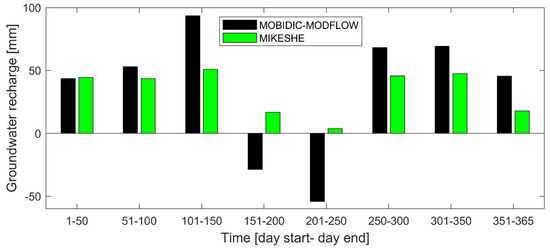 The simulated catchment scale variation of groundwater recharge in the two models is shown in Figure 12. The annual groundwater recharge simulated with MIKE SHE and MOBIDIC-MODFLOW are 270.2 and 290 mm, respectively. These values compare favorably with the results of [19], who obtained 315 mm by applying the hydrograph separation method to the observed streamflow; and 349 mm by using CATHY, a physically-based, distributed surface-subsurface hydrological model.