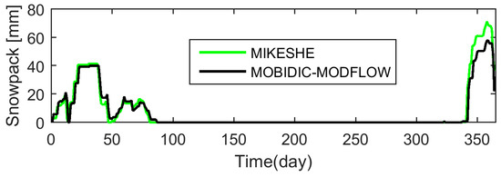 Simulated snowpack accumulation/depletion with MIKE SHE (green) and MOBIDIC-MODFLOW (black).