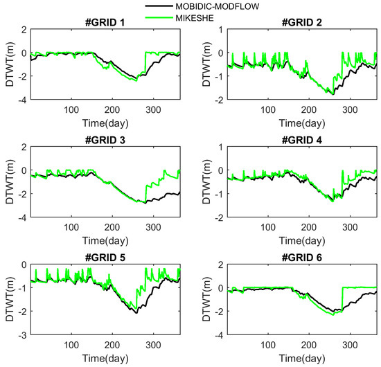 Simulated water table fluctuation at six shallow water table grids with MIKE SHE (green) and MOBIDIC-MODFLOW (black). DTWT stands for depth to water table.