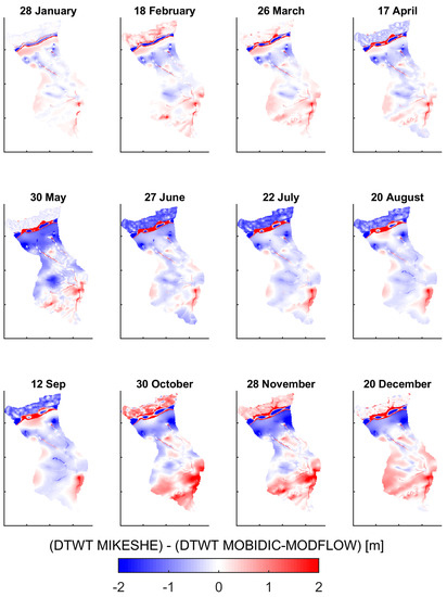 Temporal variation of the differences in depth to water table levels of MOBIDIC-MODFLOW and MIKE SHE. Positive values: deeper water table with MOBIDIC-MODFLOW; negative values: shallower water table depths with MOBIDIC-MODFLOW.