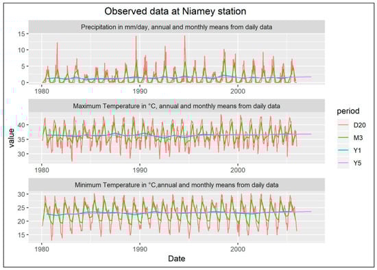 Observed rainfall, maximum temperatures, and minimum temperatures for 1980–2005 at Niamey Airport.