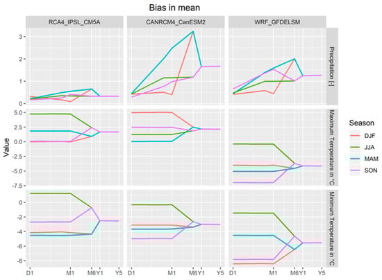 Considerable differences in the statistical characteristics of the mean biases at different timescales can be seen in Figure 3. The biases increase as time intervals increase from daily to monthly, sub-seasonal, and seasonal (yearly) averages. CANRCM4 and WRF present the largest biases in mean precipitation, while the RCA4 has less bias in rainfall and temperature data. All three regional models perform better during the JJA period, which corresponds to the rainy season, confirming the ability of the selected models to reproduce the seasonal cycle of precipitation [,]. All three RCMs have large positive biases in mean simulated historical rainfall compared to observed historical rainfall. Rainfall biases are greater for the CANRCM4 model, followed by the WRF and RCA4 models, and particularly for the MAM period, where the biases in the mean reached up to 300%. The observed large biases are probably due to the general wet-day biases of uncorrected RCMs.