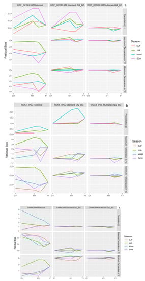 As for the temperatures, the CANRCM4 and RCA4 models show positive maximum temperatures biases, whereas the WRF model is negatively biased for all seasons. The three RCMs have negative minimum temperatures biases for all the seasons, except for the JJA period, where they are positively biased, with the WRF recording the largest minimum temperature biases. Biases calculated using corrected and original (uncorrected) rainfall, along with maximum and minimum temperature time series for the three RCMs, are shown in Figure 4a–c for the standard and multiscale quantile–quantile mapping bias correction (QQ_BC) methods, and for different seasons of the year. The observed historical climate data (see Figure 2) is used to evaluate the performance of the two bias correction methods for the three RCMs for the simulated historical period (1980–2005). In Figure 4a–c, residual biases are averaged and expressed as relative difference values (to observed historical) for rainfall data and in absolute differences for temperatures data on daily (D1), monthly (M1), and yearly (Y1) timescales.