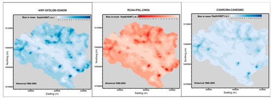 To validate historical simulations of depth-to-groundwater tables for the three RCMs, the bias in the mean depth-to-groundwater table is shown in Figure 6. The bias in mean depth-to-groundwater table is calculated as the difference between simulated observed historical climate data and simulated historical climate scenarios for the three RCMs considered.