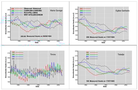 Figure 7 shows that the historical simulated groundwater heads from the climate scenario match reasonably well with the long-term seasonal variability of the observed simulated historical groundwater heads. Average 1980–2005 groundwater heads are shown as values, and groundwater head measurements are plotted at the bottom of each figure. These measured groundwater heads were reconstituted from historical measurements performed during the 1980s at the construction of the boreholes (Figure 7). All three RCMs tend to overestimate the groundwater heads for 1980–1994 and underestimate heads for 1994–2005. WRF shows the largest dry (wet) groundwater head bias, and CANRCM4 has the smallest dry (wet) head bias, while the CRA4 lies in between them (Figure 7). Historical transient groundwater heads, as simulated herein, show a general decrease between 1980–1994 and an increase from 1994–2005. This long-term increase of groundwater heads is probably due to the recent Sahelian rainfall regime changes recorded in the central part of the Sahel [], where the 1989–2007 average rainfall exceeded the average rainfall for 1979–1990 by 10%. The increase in groundwater heads highlights the important sensitivity of the groundwater response to rainfall pattern changes.