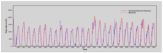 Measured surface flow rates of the Niger River at the Niamey gauging station were used to validate the surface component of the integrated HGS model. Figure 8 shows the measured and simulated historical flowrates for 1980–2005. Simulated flowrates match the measured flow well during all the simulated periods.