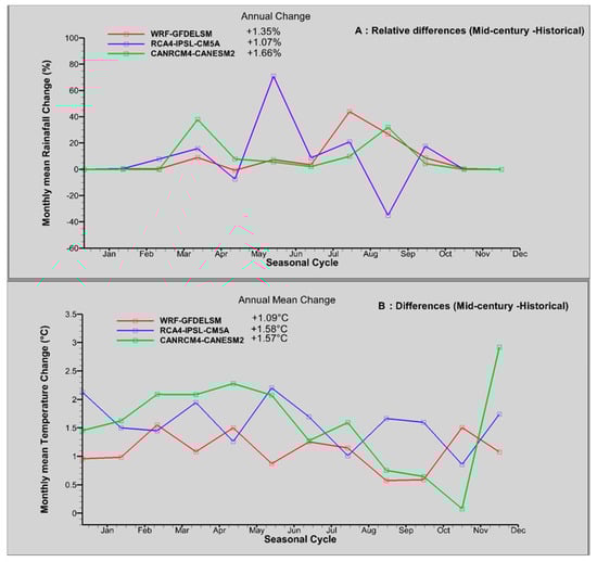 The projected climate change scenarios are presented as relative differences for rainfall (Figure 9A) and as absolute differences for mean temperature (Figure 9B) between simulated historical and mid-century periods. All three RCMs consistently projected an increase in the mean annual rainfall, with the CANRCM4 model projecting a mean annual increase of 1.66%, followed by the WRF model projecting a rainfall increase of 1.35% and the RCA4 model with an increase of 1.05%. During the rainy season (JJA), WRF and CANRCM4 models project a large increase in rainfall, while the RCA4 project a drier future (Figure 9A,B). Similar to rainfall, mean annual temperatures are projected to increase by 1.58 °C for RCA4, 1.57 °C for CANRCM4, and 1.09 °C for WRF. For all three models, greater temperature increases are projected for the MAM period, while increases are relatively smaller for the JJA and SON periods.
