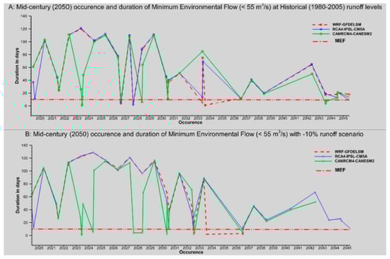 MEF duration and occurrences are assessed under historical runoff (1980–2005), where the mid-century runoffs are kept to the historical levels (Figure 10A), and under 10% runoff reduction scenarios (Figure 10B), where runoff conditions are considered to be reduced by 10% compared to historical levels. Overall, all three models almost agree for the occurrence of the MEF, with different durations ranging from 10 to 120 days under both historical and −10% runoff scenarios.