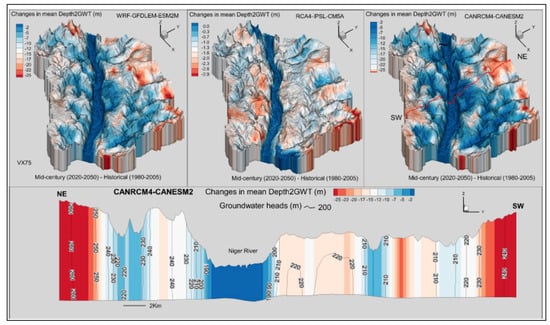 Changes in depth-to-groundwater table. Top panel: mean changes in depth-to-groundwater table by the mid-century for the three RCMs; bottom panel: two-dimensional (2D) cross-section for the CANRCM.