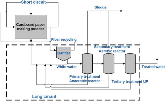 Moreover, the diversity of raw materials used in recycled cardboard papers requires a great knowledge of water circuits to adopt an adequate decision on internal water recycling. In a conventional cardboard paper mill, several water loops can be present with different uses in the papermaking process (Figure 1). Short circuits are used for water recycling without treatment. Other internal water circulation, named long circuits, are carried out after flotation or clarification as the first wastewater treatment process followed by other conventional wastewater treatments [4,5,6]. The most utilized of them used to be biological treatments, but in many cases, they are insufficient to comply with the most stringent environmental regulations on effluent discharge or to obtain a suitable quality for the process water to be reused in papermaking.