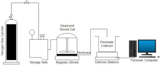 As the foulant fraction between 0.45 μm and 100 kDa is the major fraction contributing to the membrane fouling [27], PMTE was a pre-filtrated at 0.45 µm to eliminate larger suspended solids and higher molecular weight colloids. Then, filtration experiments were carried out in a 400 mL stirring cell (Amicon 8400, Merck-Millipore, Merck KGaA, Darmstadt, Germany) connected to a pressurized tank (800 mL) and operated in dead-end filtration mode to filter large volumes of sample. The UF setup is shown in Figure 2.