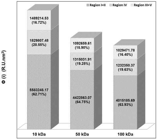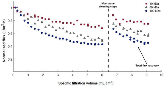 Furthermore, as described in the filtration protocol, at the end of the UF and after the cleaning steps, the flux decline and flux recovery for each MWCO was estimated using Equations (10) and (11), sequentially: