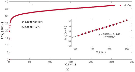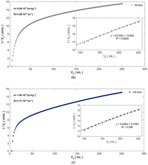 Therefore, the classic method for determining is to measure as a function of time, t, during dead-end UF at constant pressure. Specific cake resistance can be calculated from the well-known expression derived using (Equation (1) and Equation (2)) and solving the follow integration [30]: