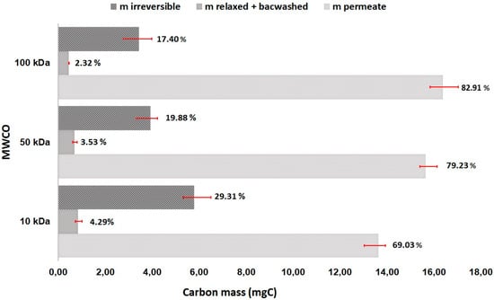 After the cleaning steps (relaxation + backwashing), TOC measurements were performed for each collected solution (feed, permeate, relaxation, and backwashing) and the residual carbon mass on the membrane, termed irreversible carbon, was estimated using Equation (13).
