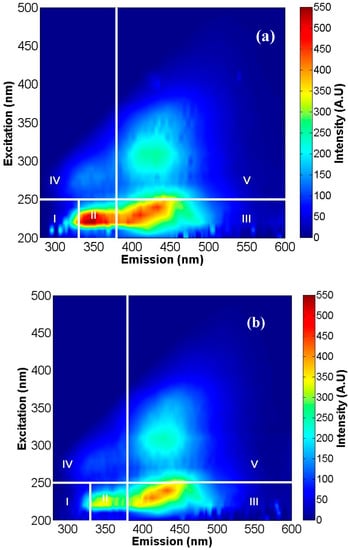 DCS fractions, and consequently 3DEEM data, were analyzed quantitatively using the volume of fluorescence (R.U.nm2) parameter from the fluorescence regional integration (FRI) method originally proposed by W. Chen et al. [21]. This methodology permits all the fluorescent compounds detected within each fluorophore region (Table 3) to be considered. Fluorescence volumes were calculated from the corrected matrix, using the Equation (1) [21]: