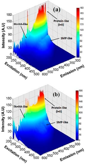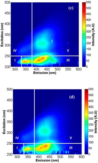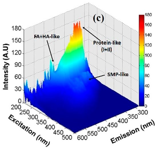 3DEEM analyses were performed using a Perkin-Elmer, LS-55 fluorescence spectrometer (PerkinElmer Inc., Waltham, MA, USA) at room temperature (22.0 ± 2 °C). In this study, 3DEEM spectra were collected with the scanning excitation wavelength set at 200–500 nm and the emission wavelength from 280 nm to 600 nm. Scan speed was set at 1000 nm/min and the increment to 2 nm, while the slit width was set at 10 nm in excitation and emission [20,21]. To avoid Raman scatter by the particles [19], fluorescence measurements were done on pre-filtered (0.45 µm) at room temperature (22 ± 2 °C). To limit overlapping signals and avoid the inner filter effect, the samples were diluted with pure water (Mili-Q, Millipore, Merck KGaA, Darmstadt, Germany) with a dilution ratio determined after measurements at successive dilution ratios [20,41,42]. All spectra were Raman normalized using a Mili-Q water blank (the Milli-Q water spectrum was subtracted from the 3DEEM spectrum for each sample) following the procedure described by Peiris et al. [22] and Goletz et al. [43].