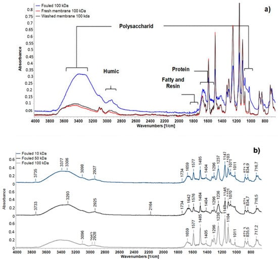 - Maruyama, T. FT-IR analysis of BSA fouled on ultrafiltration and microfiltration membranes. J. Membr. Sci. 2001, 192, 201–207. [Google Scholar] [CrossRef]