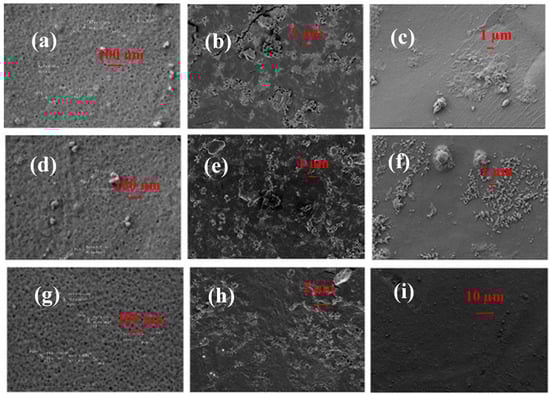 Field emission scanning electron microscopy (FESEM) images of the membrane surfaces (a) fresh 10 kDa MWCO, (b) fouled 10 kDa MWCO, (c) cleaned 10 kDa MWCO; (d) fresh 50 kDa MWCO, (e) fouled 50 kDa MWCO, (f) cleaned 50 kDa MWCO; (g) fresh 100 kDa MWCO, (h) fouled 100 kDa MWCO, (i) cleaned 100 kDa MWCO.