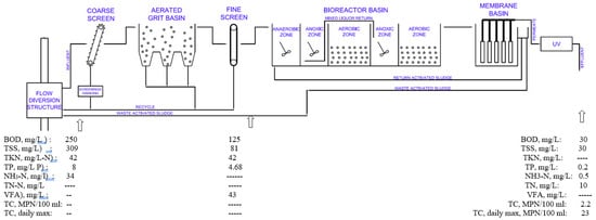 The influent and effluent quality used in the design is depicted in Figure 1. The effluent requirements are typical water reuse standards found in California and Florida [], with the exception for the need to remove nutrients.