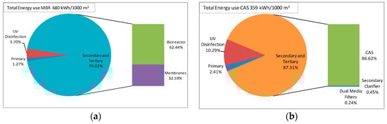 For blowers, efficiencies were increased by 5% and 10% for the high efficiency range and decreased by 5% and 10% for the low efficiency range. These increments were chosen as they covered the typical range of blower efficiencies of 70% to 90% [,]. Detailed results on sensitivity analysis are provided in Tables S3 and S4 in Supplementary Material. The sensitivity analysis revealed that when efficiencies were decreased by 10%, a 10.9% and 11.3% increase in energy consumption occurred for MBR WRPs with UV radiation and MBR WRPs with chlorination, respectively. A 9.3% and 10.4% increase in energy consumption was found for CAS WRPs with UV radiation and chlorination, respectively. When efficiencies were increased by 10%, a 9.1% and 9.4% decrease in energy consumption occurred for MBR WRPs with UV radiation and chlorination, respectively. Decreases of 8.1 and 9.0% were observed for CAS WRPs with UV radiation and chlorination, respectively. Overall, this analysis has shown that with a 10% increase or decrease in efficiencies, the total energy consumption of the entire plant can be affected, by as much as an 11.3% increase or a 9.4% decrease. For readers interested in more details on sensitivity analysis, additional information is provided as Supplementary Material.