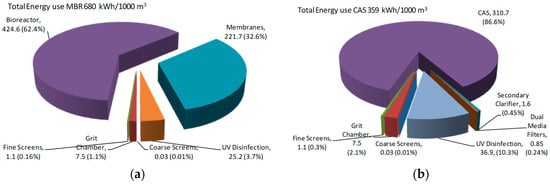 The MBR process, on average for the flow ranges investigated, was roughly 2.1 times more energy intensive than the traditional CAS process. Previous reports estimated that MBRs consumed twice to three times the energy of CAS processes [,,].