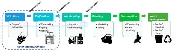 The WF of a product is defined as the total volume of freshwater used directly or indirectly across its end-to-end supply chain [20]. Figure 1 illustrates the different stages of a wine supply chain, highlighting the viticulture and the vinification phases as the prevalent WF contributors. To quantify the WF of wine, several methodological approaches exist; the WF assessment manual that focusses on the volumetric measurement of water consumption and pollution [8] and the life cycle assessment (LCA) techniques (e.g., the ISO 14046 [21]), further including the impact of water scarcity (which varies spatially and temporally) on the WF indicator [14], constitute the most common ones. Although a comparison among the different WF assessment approaches is considered out of the scope of this research, a more detailed analysis of their unique charasterics is provided by Chenoweth et al. [22].