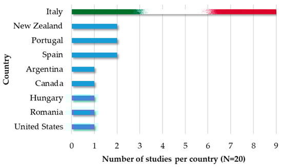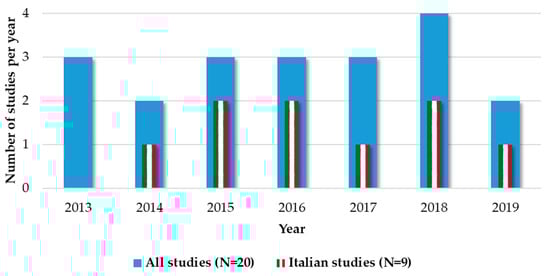 Figure 2 illustrates the distribution of the case studies on wine WF assessment by country. Notably, Italy dominates the wine WF research (i.e., nine out of 20 studies), confirming (i) the leading role of the Italian winemaking industry both within the country [16] and abroad [1], and (ii) the increased water scarcity concerns in the region [14], followed by New Zealand, Portugal, and Spain (i.e., two out of 20 studies each). Notably, there is an apparent absence of WF studies for French wines, despite the major economic impact of the country’s winemaking sector worldwide [17], which is potentially due to lower water scarcity indices compared to Italy [14]. In addition, Figure 3 depicts the distribution of the studies by year of publication. In fact, the research on wine WF assessment has received a rather constant interest during the last 6.5 years (i.e., the first paper was identified in 2013), exhibiting an average of 2.9 studies per year worldwide and 1.2 studies annually in Italy.