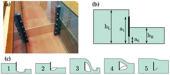 Figure 1a shows how the physical model of the leaky barrier consists of a single horizontal aluminium sheet with a gap underneath. Some flow will always pass under the barrier and, in high flows, there will be flow over the barrier too. In the terminology from the literature, the barrier is like an underflow jam []. Such barriers have been modelled by adding together the sluice gate and rectangular weir equations [,].