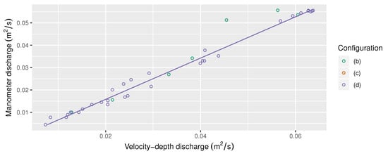 The relationship between velocity-depth and manometer discharges, with regression for (d).
