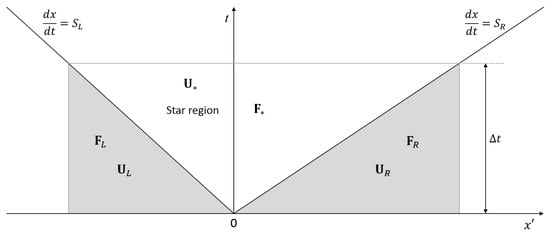 The HLL Riemann solver of [] is used to estimate the flux through the cell interface. Suppose the conserved variables to the left of a given interface are and those to the right are as shown in Figure 3, where O is a local origin located at the cell interface. Then the flux through the interface is approximated by