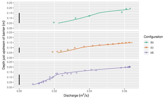 Measured depth-discharge relationship (circles) and the empirical discharge equation with and (lines) for each barrier configuration. Only includes free-flow scenarios where the depth is greater than the gap underneath the barrier.