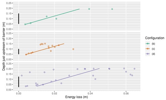 Estimated measured energy losses (circles) and the regression Equation (38) (lines) for each barrier configuration. Only includes free-flow scenarios where the depth is greater than the gap underneath the barrier.