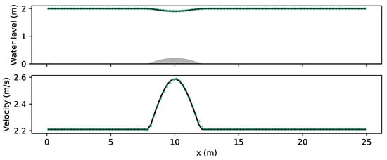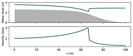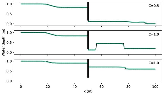 Unless the water is shallow enough to flow unimpeded below the barrier, these fluxes cannot be found using the Riemann solver (11)—there is a leaky barrier obstructing the flow and so the shallow water Equation (3) are no longer valid. There are two steps for solving a similar problem involving a sluice gate []. First, find the mass flux q through the hydraulic structure using a well-understood steady-state discharge equation. Second, find some depth h to substitute into (27) to get the momentum flux.