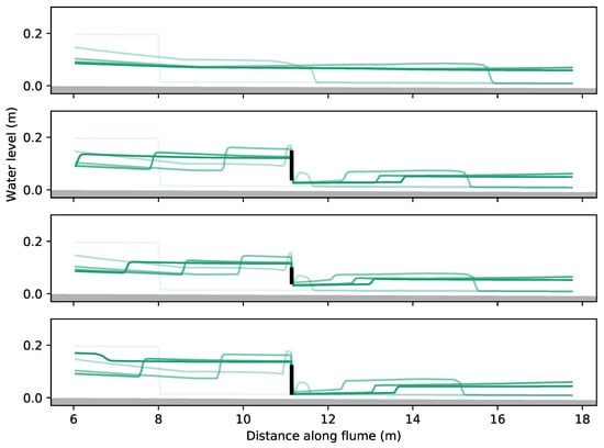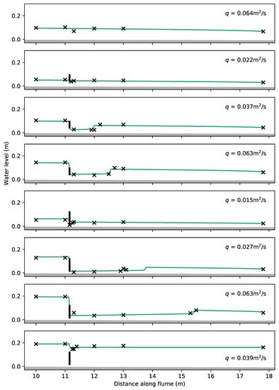 If we ignore energy loss (i.e., assume ) and solve (36) iteratively for , the water exits the leaky barrier too quickly in the 1D model, resulting in the hydraulic jump occurring further downstream than observed. However, the upstream backwater effect is captured well, indicating that the problem is not in the value of q, which determines the mass flux. This is demonstrated in Figure A1, Figure A2, Figure A3, Figure A4, Figure A5, Figure A6, Figure A7 and Figure A8 in the Appendix A. Therefore, a method for estimating in (36) was required. Incorporating energy losses into the momentum flux like this is reported elsewhere in the literature, for example, for 1D flow around islands [].