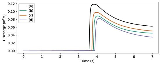 The internal boundary condition used in the 1D model is based on equations with empirical parameters in Supplementary Materials. These parameters were found by analysing the measured depths immediately upstream and downstream of the barrier. First, as the slots either side of the barrier reduced the barrier width to 0.264 m, the discharge Equation (31) was multiplied by the ratio . The discharge equation requires two more coefficients: the gate contraction coefficient and the weir discharge coefficient . For each of the 52 free-flow experiments, the depth measurements were plugged into the discharge equation, with this predicted discharge then visually compared against the measured discharge as in Figure 4. The coefficients and were found to give the best fit with the measurements, and so they were used in the numerical model.