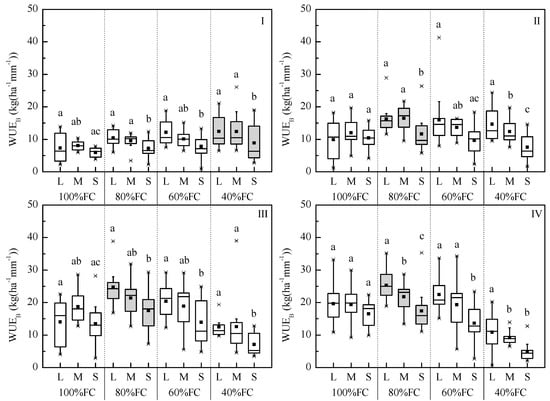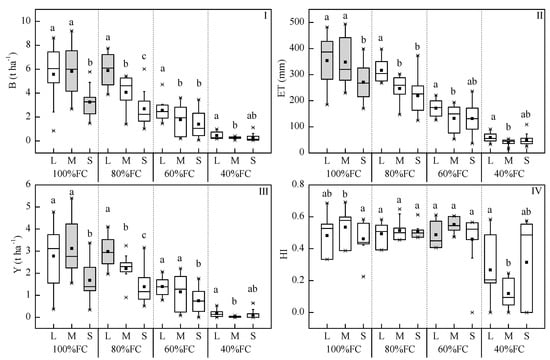 Effects of soil erosion on B (I), ET (II), Y (III) and HI (IV) under four different water conditions for the entire growth period. B, biomass. ET, evapotranspiration. Y, yield. HI, harvest index. L, lightly eroded soil. M, moderately eroded soil. S, severely eroded soil. Different letters indicate significant differences at = 0.05 (paired-samples t-tests) for different eroded soils. The gray boxes denote the indicators for optimal moisture conditions.