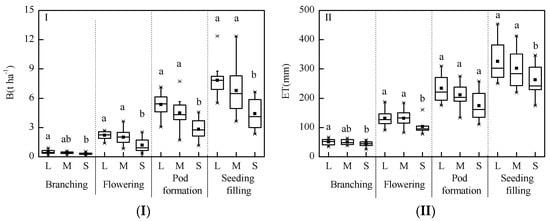 The findings for the different growth stages were similar to those for the entire growth period (Figure 2). No significant difference in B and ET were observed between L and M, but these values were significantly different from those of S ( < 0.05) under optimal water supply conditions. The daily water consumption was the largest in the pod formation stage. The average daily ET in this stage of L was 5.63 mm, which was 23.7% and 55.5% higher than in M and S, respectively, and the B value of L was 5.35 t ha−1, which was 19.2% and 89.2% higher than M and S, respectively.