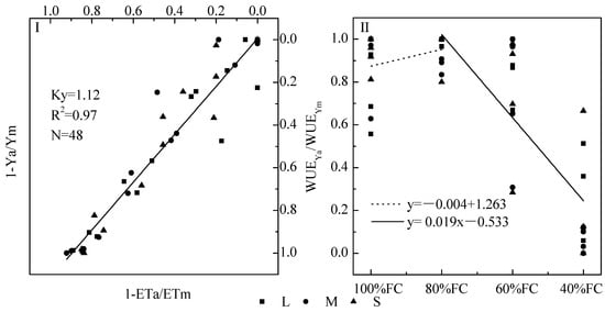 Yield response to water stress curves (I), and stress factor of water use efficiency (WUEY) stress coefficient (SF) (II) for the entire growth period.