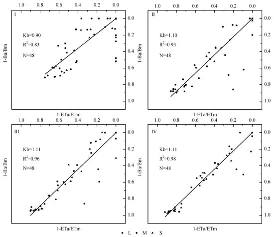 The crop yield response coefficient (Ky) is a comprehensive description of the relationship between crop yield and water stress [58,59]. Lovelli et al. [60] established the relationship between biomass and water consumption according to the response relationship of the crop growth to the water supply in different growth periods. The equations are as follows