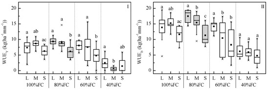 where, is the evapotranspiration (mm), is the based on the biomass (kg ha−1 mm−1), and denotes the yield-based (kg ha−1 mm−1), i is one of the four soil water content levels, is the total weight of a pot filled with soil at the ith designated soil water content level (g), is the weight of a pot that record every other day (g), R is the radius of a pot with the value of 8 (cm), d is the interval days for measured with the value of 2 (day).