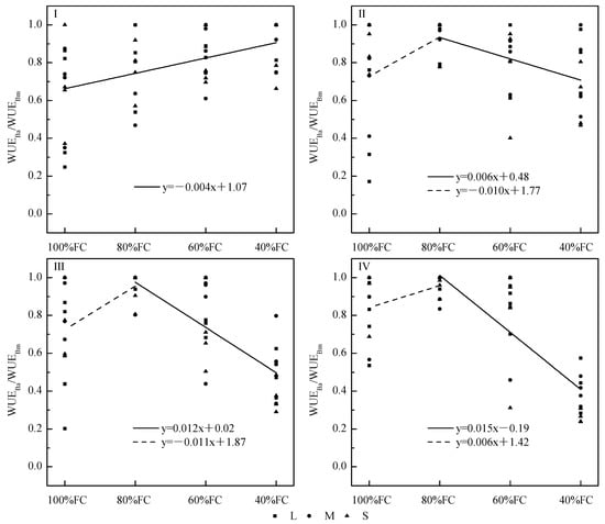 The WUEY and WUEB of soybean in soils with different degrees of erosion exhibited certain discrepancies (Figure 5). The values of WUEY and WUEB for the three eroded soils were best at 80% FC. For WUEY, no significant difference was observed between L and M, but both of these values were significantly different from the value of S ( < 0.05). However, for WUEB, there were significant differences for the three eroded soils under optimal water supply conditions. The values of WUEY and WUEB for L were 9.36 kg ha−1 mm−1 and 17.48 kg ha−1 mm−1, which were 5.1% and 11.7% higher than that of M, and 51.9% and 35.2% higher than that of S, respectively. In the waterlogged state, the WUEY and WUEB of M were the best, while, in the water stress states, the WUEY and WUEB of L were the best.