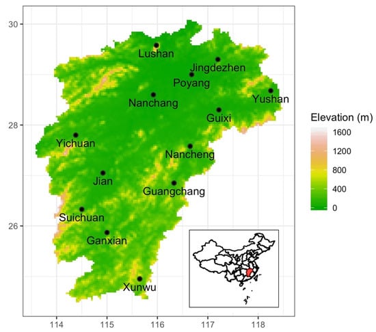 Map of Jiangxi Province showing the location of the ground-based observation stations; Inset map shows the location of Jiangxi Province (marked red) within China.